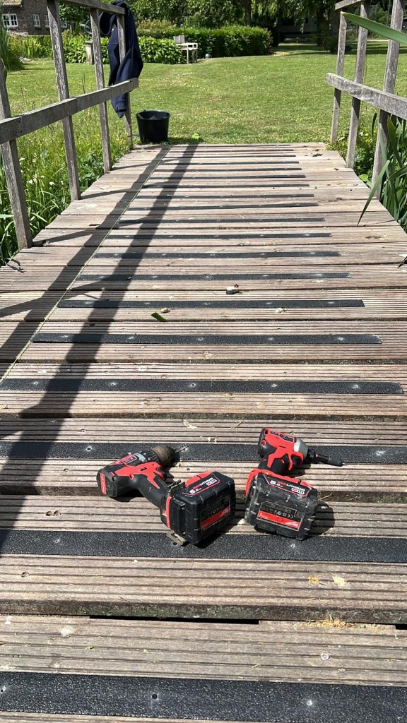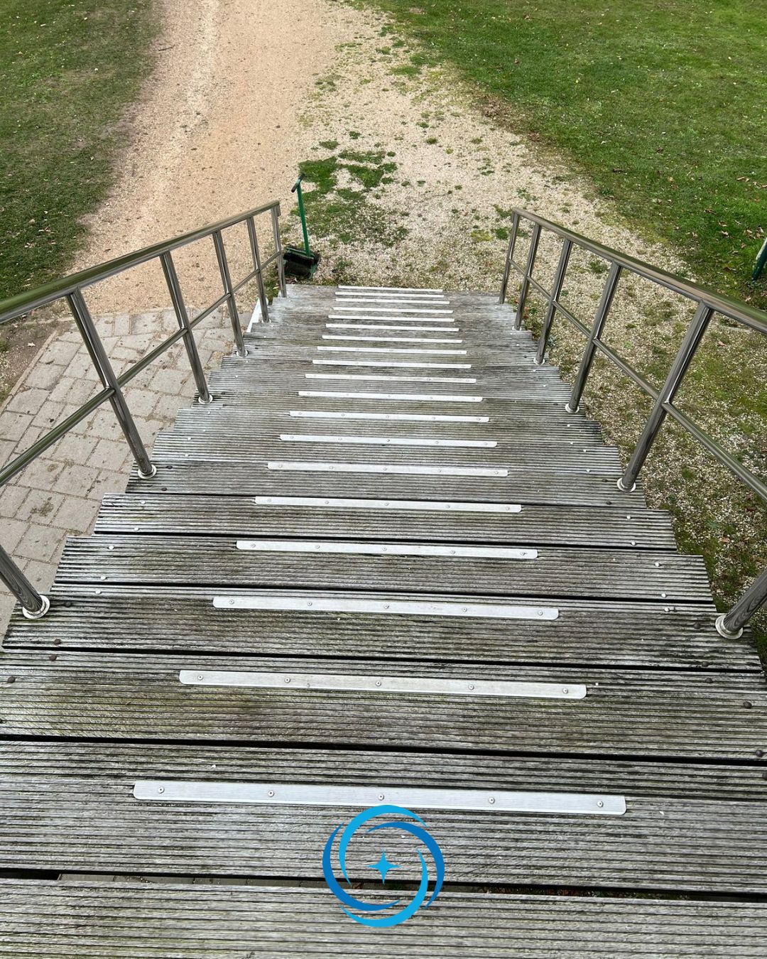 Daarom brengen wij duurzame antislipstrips aan op houten ondergronden. Deze strips worden stevig vastgeschroefd met RVS schroeven in de zelfde kleur als de strips, zodat ze jarenlang blijven zitten zonder het hout te beschadigen. Uw vlonder blijft veilig én mooi, precies zoals u het wilt.